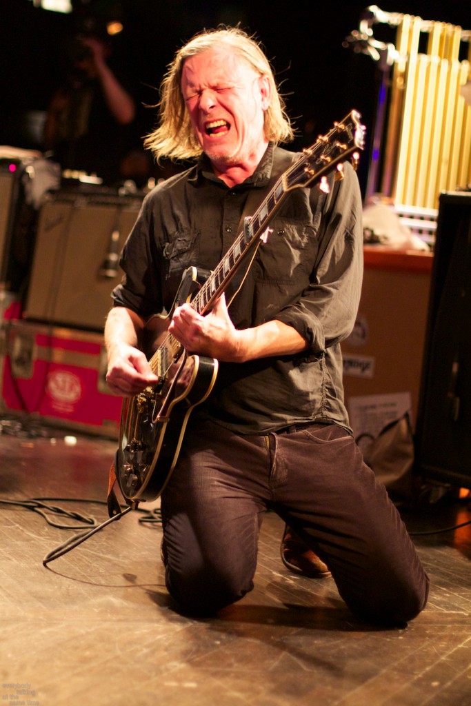 Gira himself is an incredibly physical performer. He leaps across the stage, attacks his guitar more than he strums it, howls as if conjuring a demon and generally operates with a manic intensity that’s kind of unsettling to watch. It’s clear that he pours himself into this music, and that he expects the same from the band. The marathon length songs, particularly “The Seer” and “The Apostate,” which clocked in at upwards of a half-hour each, were exhausting to watch and ostensibly brutal to participate in. The former exceeded even its massive 32-minute album length, pounding the audience into submission with huge hypnotic grooves. Getting lost in its torrents of pure physical sound wasn’t difficult though, and by the end the length felt wholly irrelevant. “Coward,” the lone 80s holdover, was the shortest song of the set, but still one of the most intense. “I’m a coward / stick your knife in me,” the lyrics go, almost playfully sung-spoken over a sparse industrial lurch. It was classic Swans, straight out of those grainy videos of scary looking shows on the Greed/Holy Money tour. And it was glorious.