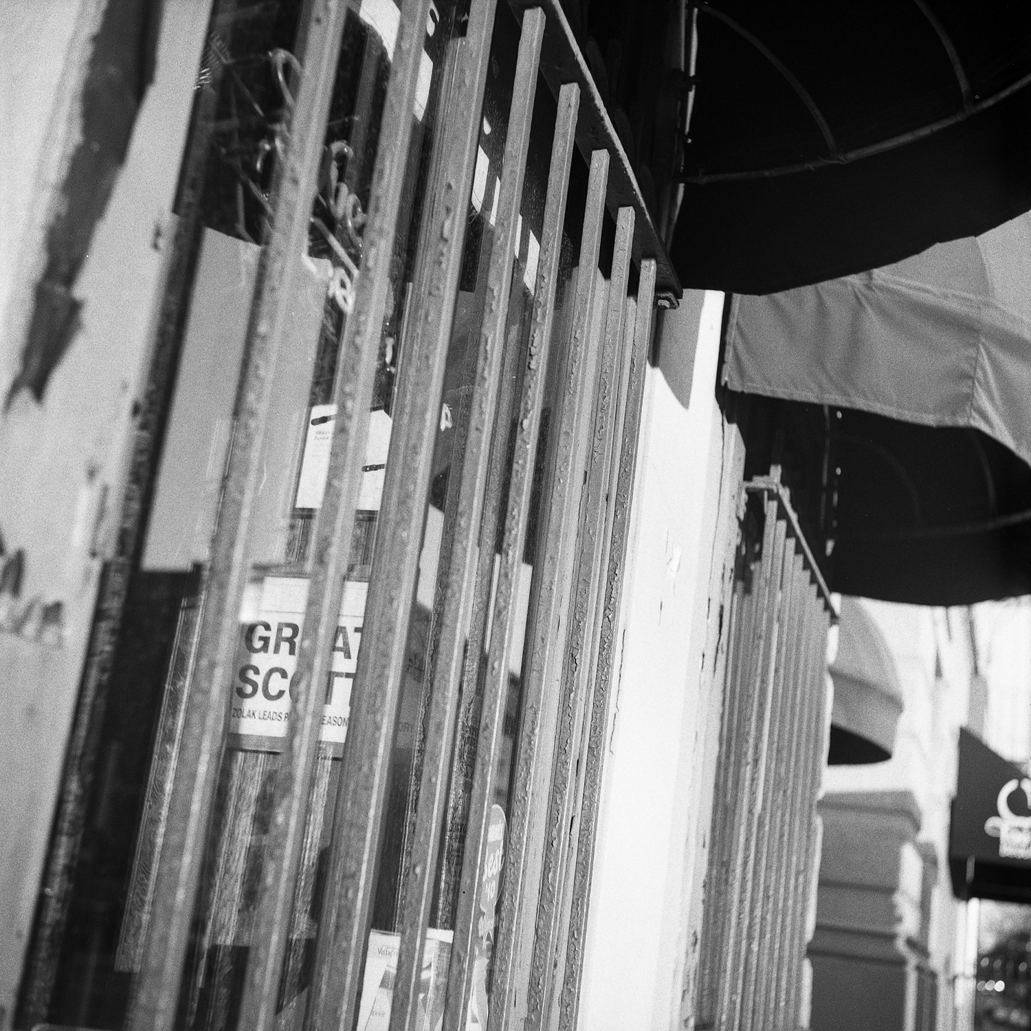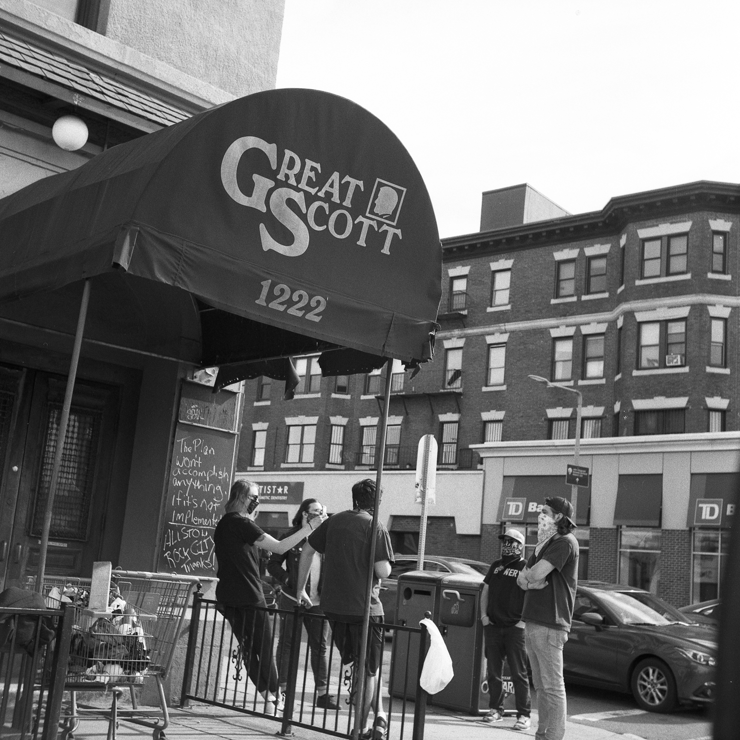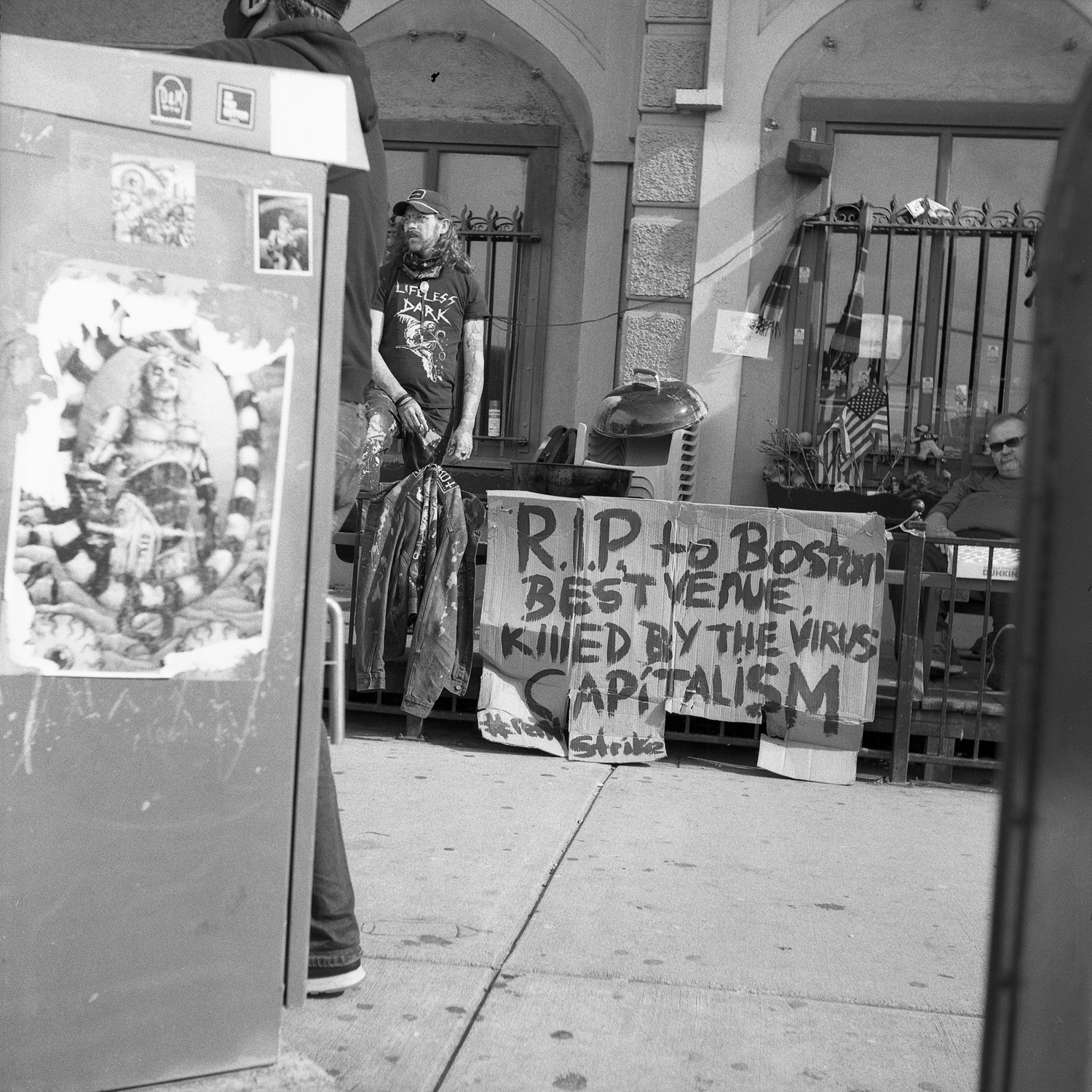 I tried to do something similar in the roll of medium format dedicated to Great Scott you see here, partly documenting the memorials left outside and partly just taking in the space in a way I hadn’t before. It’s not too often that one takes the time to look at a venue the way a few folks did on the weekend of Great Scott’s officially-announced demise, gathering at a reasonable social distance on the Comm. Ave. sidewalk to drink a beer and publicly lament, or like I did a week later, quietly studying its exterior in late afternoon sunlight.
