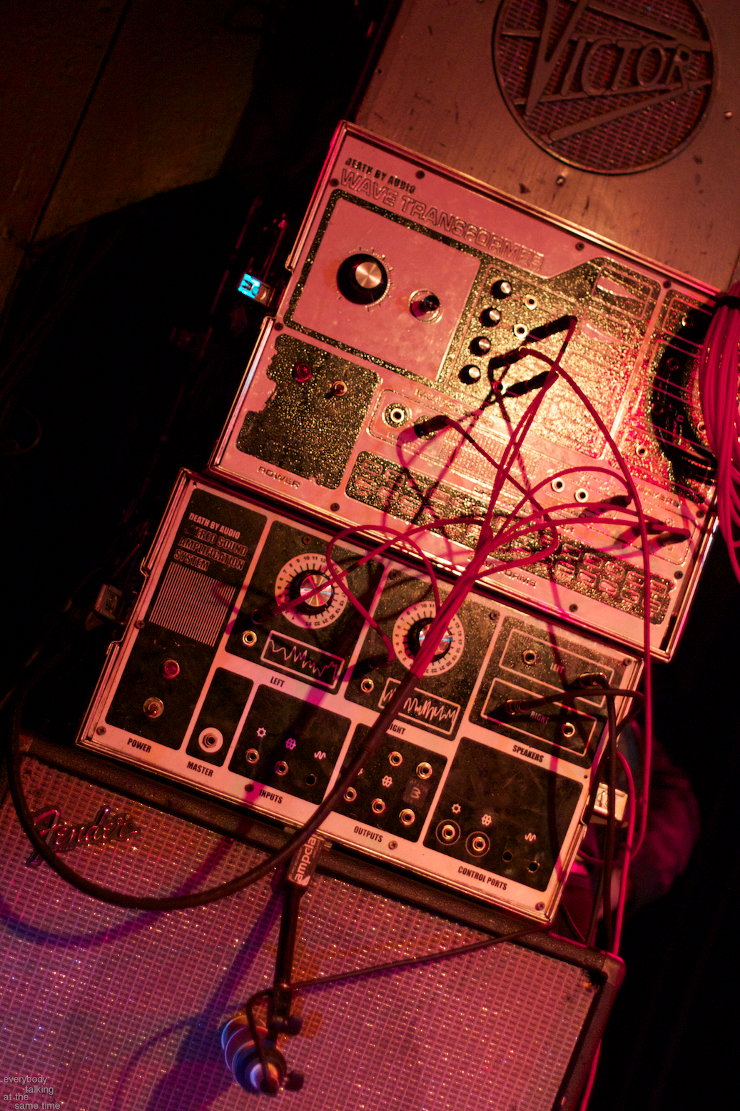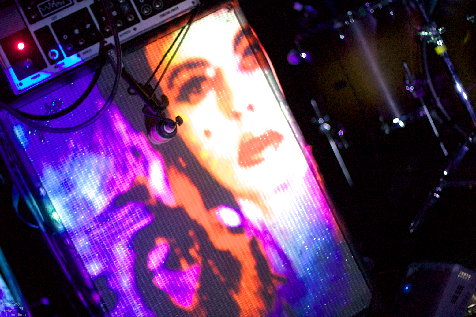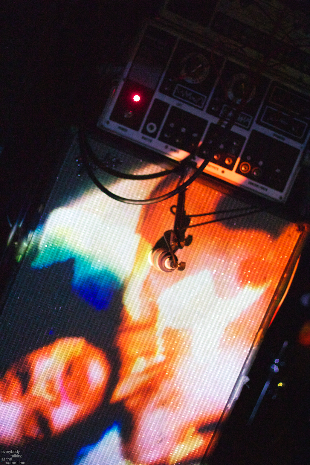A sub-200 capacity venue suits A Place to Bury Strangers exceptionally well. Their live show is all about sensory overload, and the smaller the room is, the harder it hits. They forwent traditional stage lights entirely, plunging the room into total darkness and illuminating themselves sparingly with splashed colors from projectors situated around the stage. Custom amplifier heads from frontman Oliver Ackermann’s effects pedal company Death By Audio stood atop speaker cabinets that dwarfed everyone in the room, and every instrument on stage looked to have barely survived a war zone. Once the band plugged in and turned up, a sonic war zone was essentially what the audience was in for.