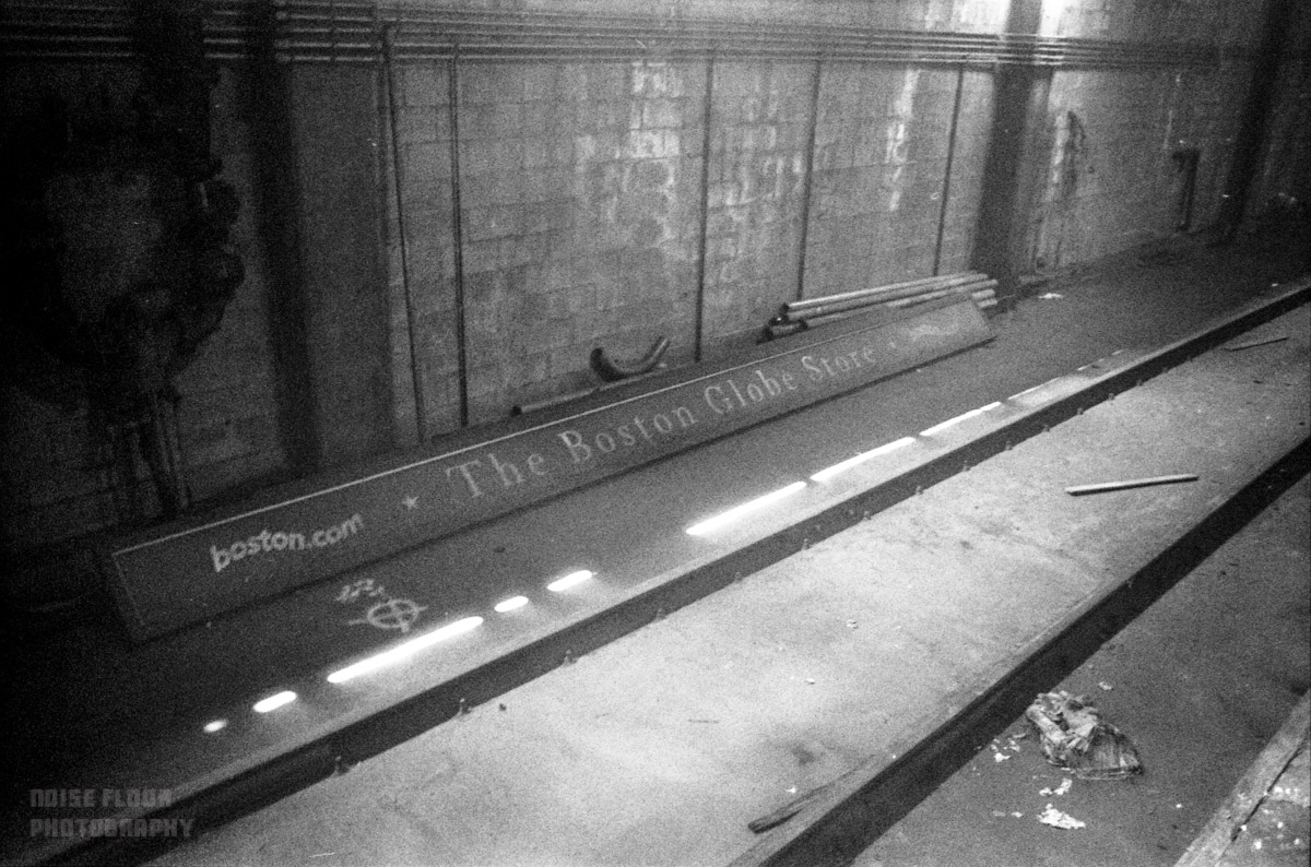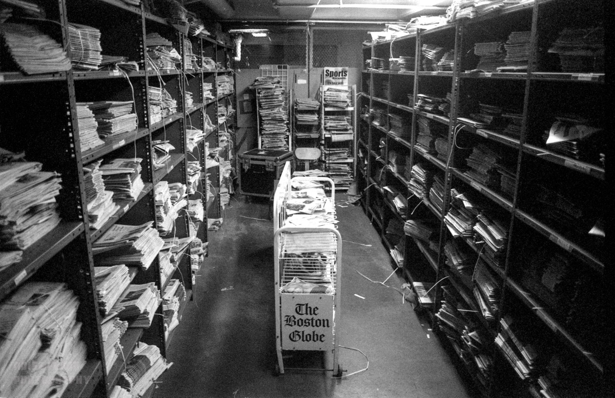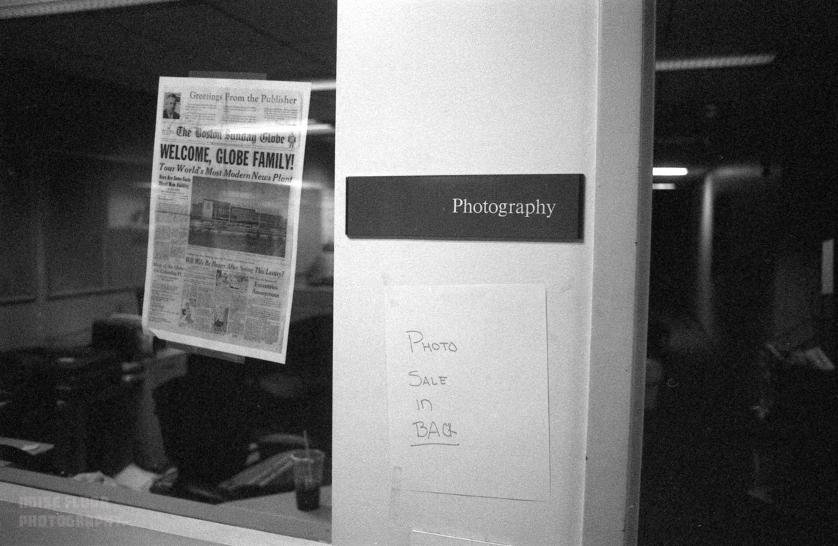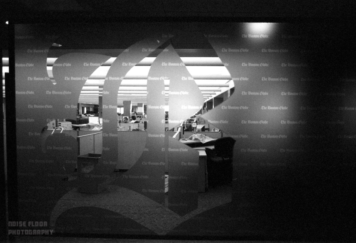 As you may have heard, my employer The Boston Globe recently relocated from its longtime home at 135 Morrissey Boulevard in Dorchester to a shiny new headquarters on State Street downtown. On our final days at the old building, armed with rolls of expired Tri-X film salvaged from a staff photographer’s locker, a colleague and I ventured around its many mysterious corridors to capture some some sense of the end of the era.