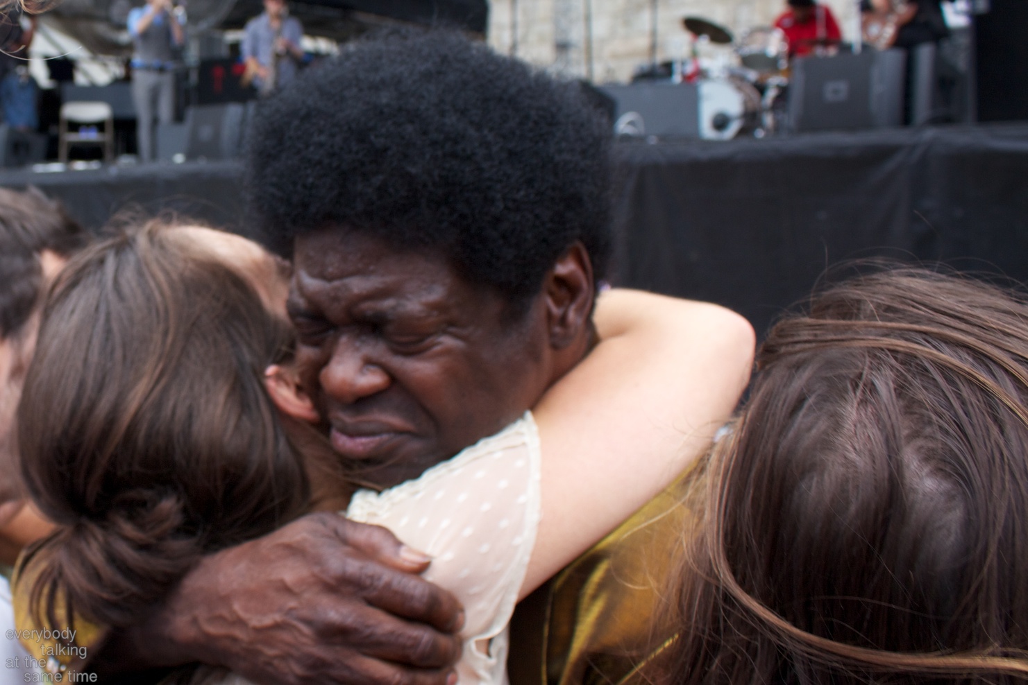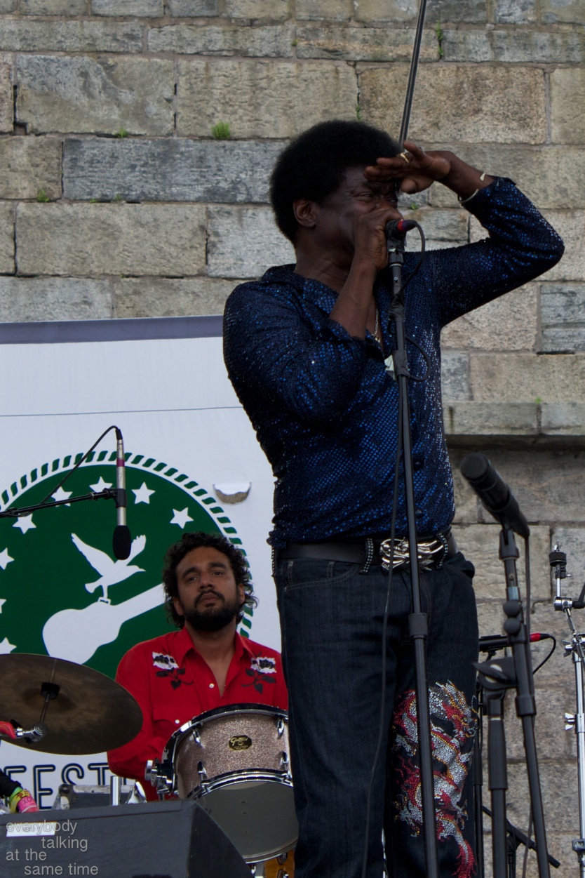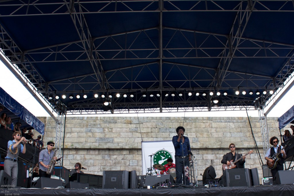 My first set on Sunday was the one and only “screaming eagle of soul”: Charles Bradley. Never heard of him? Don’t worry, neither had I. The former James Brown impersonator has only one record to his name despite many years of performance experience. Much of the early afternoon crowd didn’t seem too familiar either, but Bradley and his Extraordinaires (aka his brass-featuring six-piece backing band) soon had plenty of us up and dancing. Bradley’s years as James Brown show on stage in the best possible way. He’s all charisma, rough-edged vocals, showy stage moves and fabulous shirts. There’s also vulnerability and humanity to his performance though, and he clearly gives it his all. Immediately following the set he came down from the stage to give every member of the front row a hug, tears in his eyes. Bradley was certainly not a typical folk fest act, but still a genuine, earnest and wholly entertaining performer.